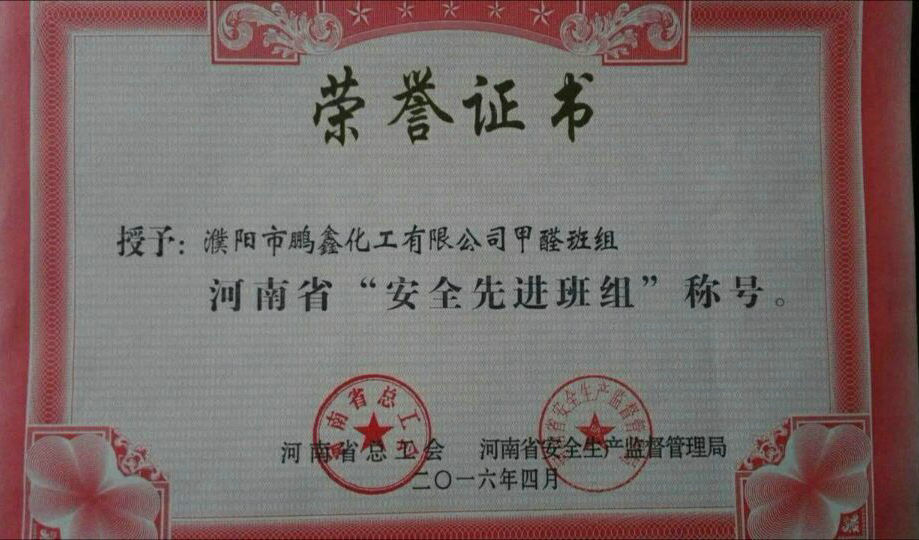 公司甲醛車間榮獲“河南省安全先進班組”榮譽稱號