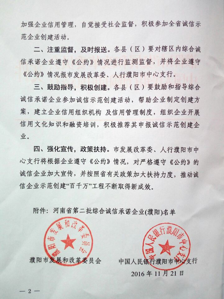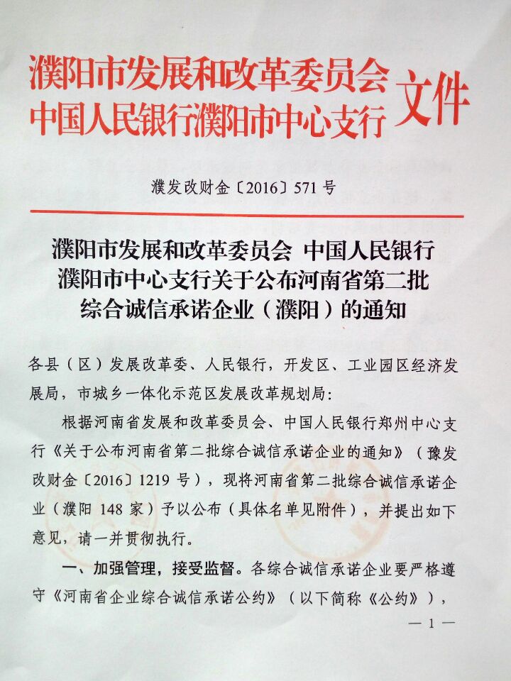 根據河南省發(fā)改委、中國人行鄭州支行通知要求,濮陽市發(fā)改委、人行濮陽中心支行近日聯合下發(fā)了河南省第二批誠信承諾企業(yè)(濮陽)名單,我公司也在名單之內!