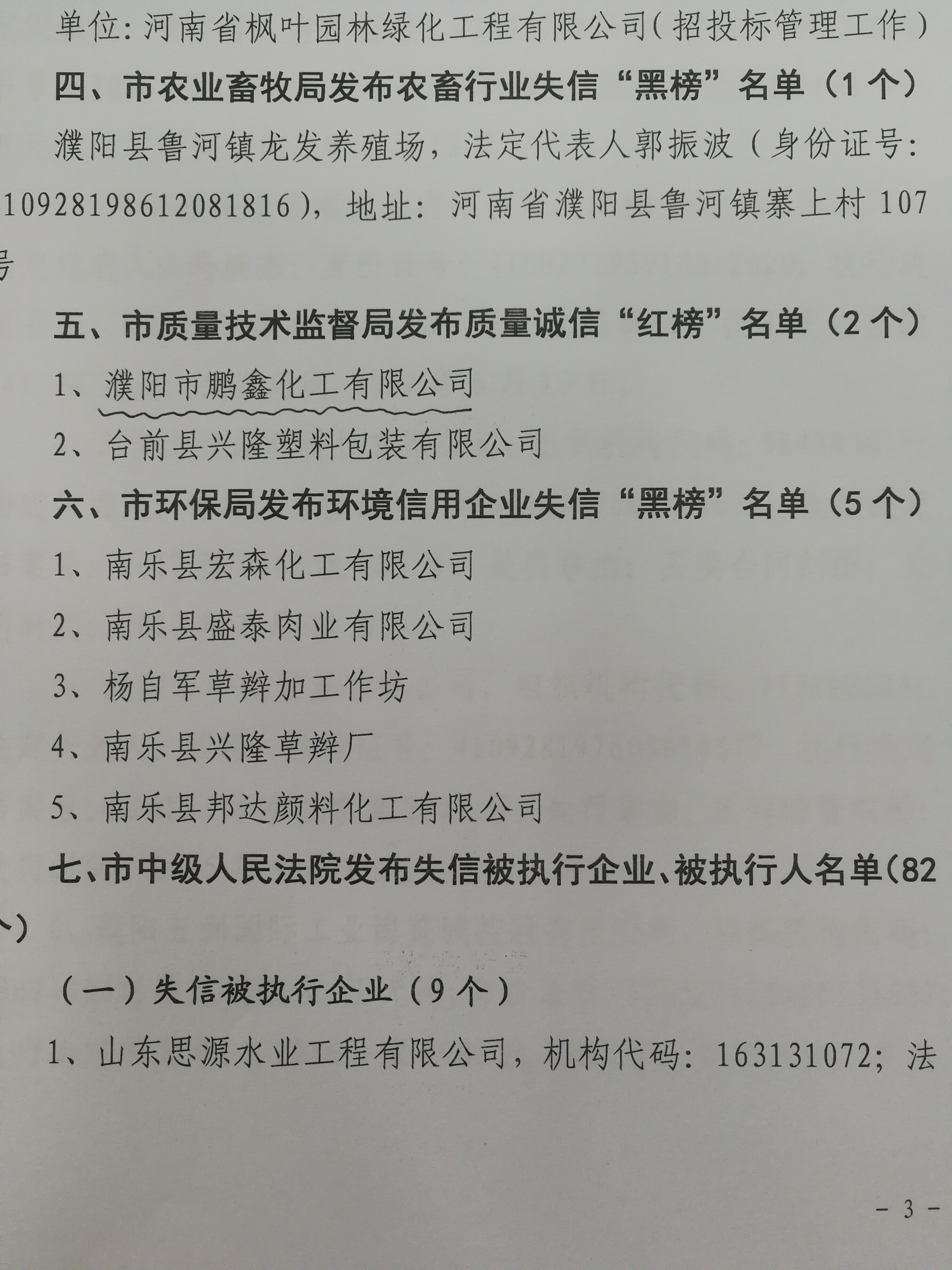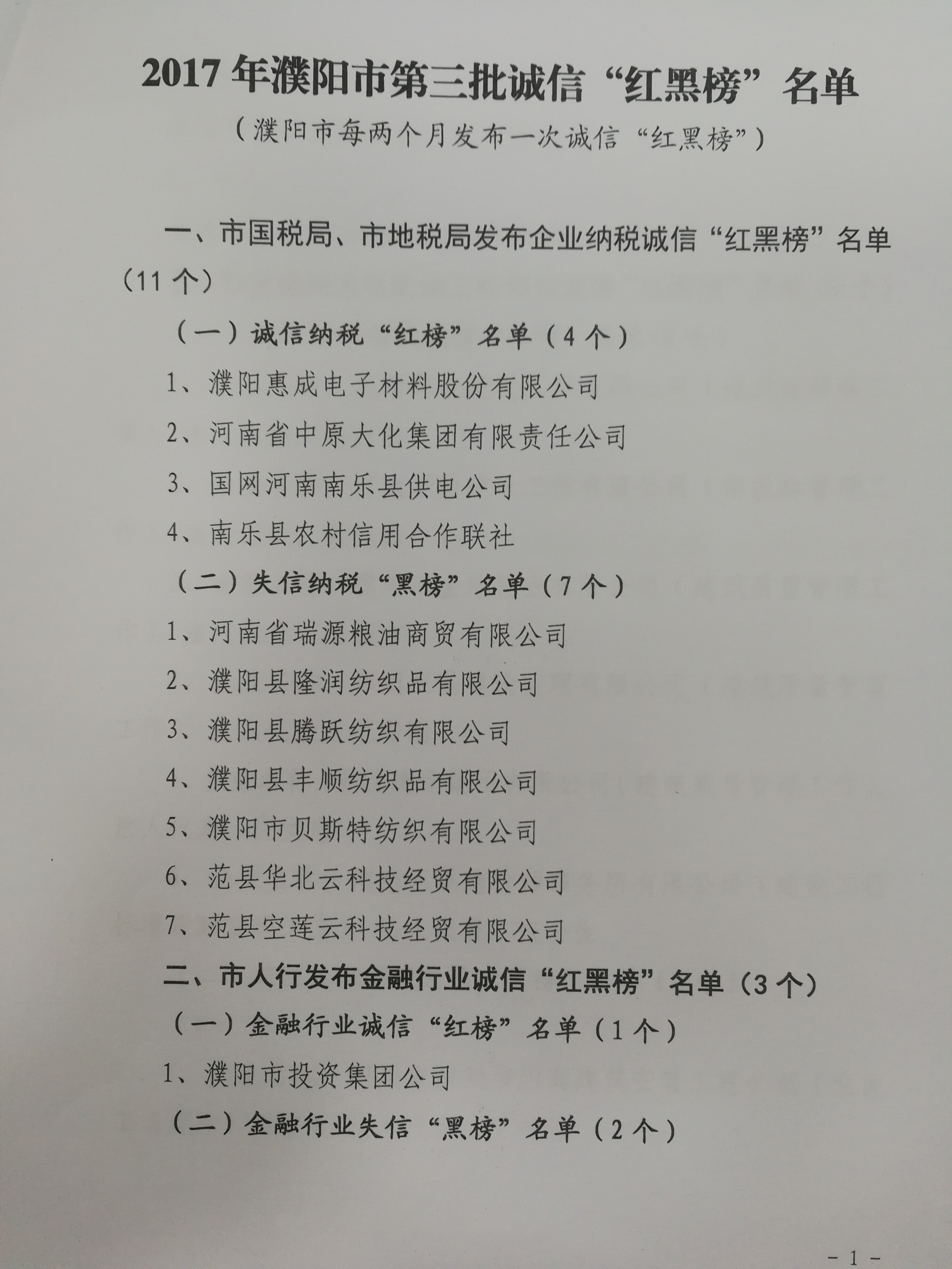 我公司榮登濮陽市2017年第三批“質(zhì)量誠信紅榜”