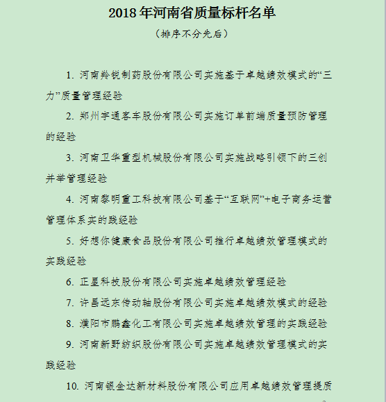 近日,河南省工信委“豫工信辦科〔2018〕96號(hào)文”公布了2018年河南省質(zhì)量標(biāo)桿名單。