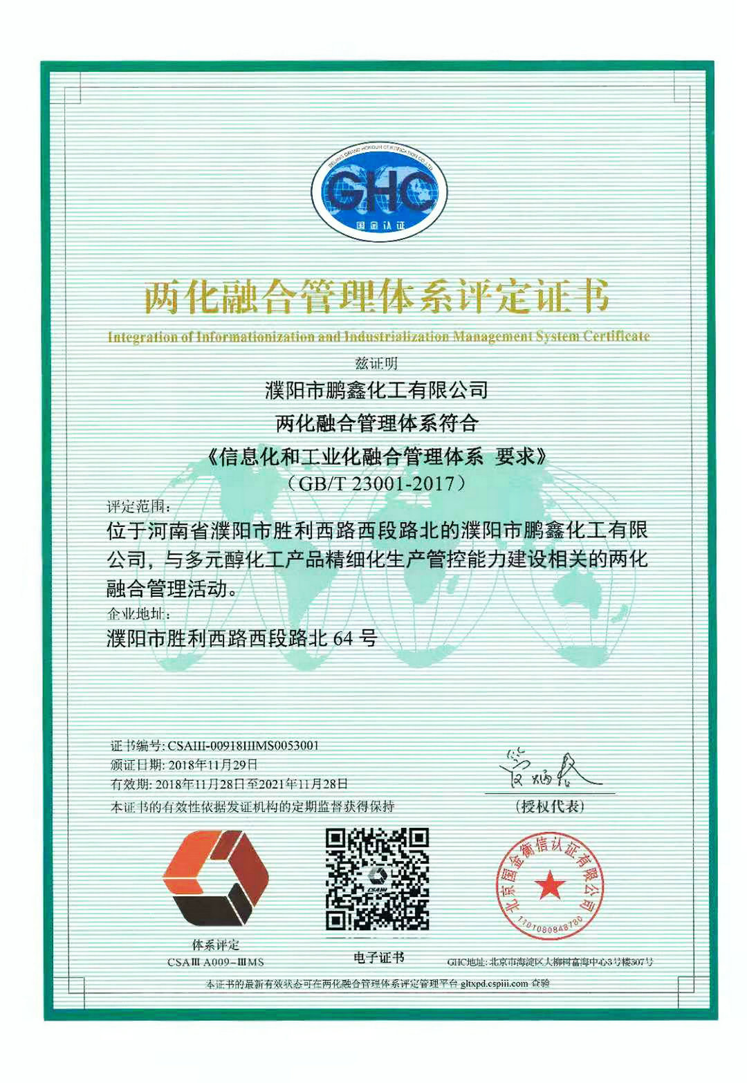 近日,濮陽市鵬鑫化工有限公司通過兩化融合管理體系貫標(biāo)評定,獲得由國家工信部授權(quán)的全國10家評定機(jī)構(gòu)之一:北京國金衡信認(rèn)證有限公司頒發(fā)的GB/T23001-2017“兩化融合管理體系評定證書”,這標(biāo)志著鵬鑫化工在推進(jìn)信息化和工業(yè)化融合方面取得了新突破。