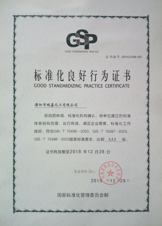 近日,公司順利通過河南省和濮陽市標(biāo)準(zhǔn)化專家組驗收,獲得“標(biāo)準(zhǔn)化良好行為企業(yè)”3A級證書,此次標(biāo)準(zhǔn)化良好行業(yè)企業(yè)證書的獲得,表明公司各種標(biāo)準(zhǔn)體系建立結(jié)構(gòu)合理,在生產(chǎn)經(jīng)營管理中有效發(fā)揮系統(tǒng)作用,滿足企業(yè)的需求,且全體員工的標(biāo)準(zhǔn)化意識有了較大提高,能有效推動企業(yè)標(biāo)準(zhǔn)化工作的運(yùn)行。這標(biāo)志著鵬鑫化工已進(jìn)入標(biāo)準(zhǔn)化、程序化、規(guī)范化、科學(xué)化的發(fā)展軌道。